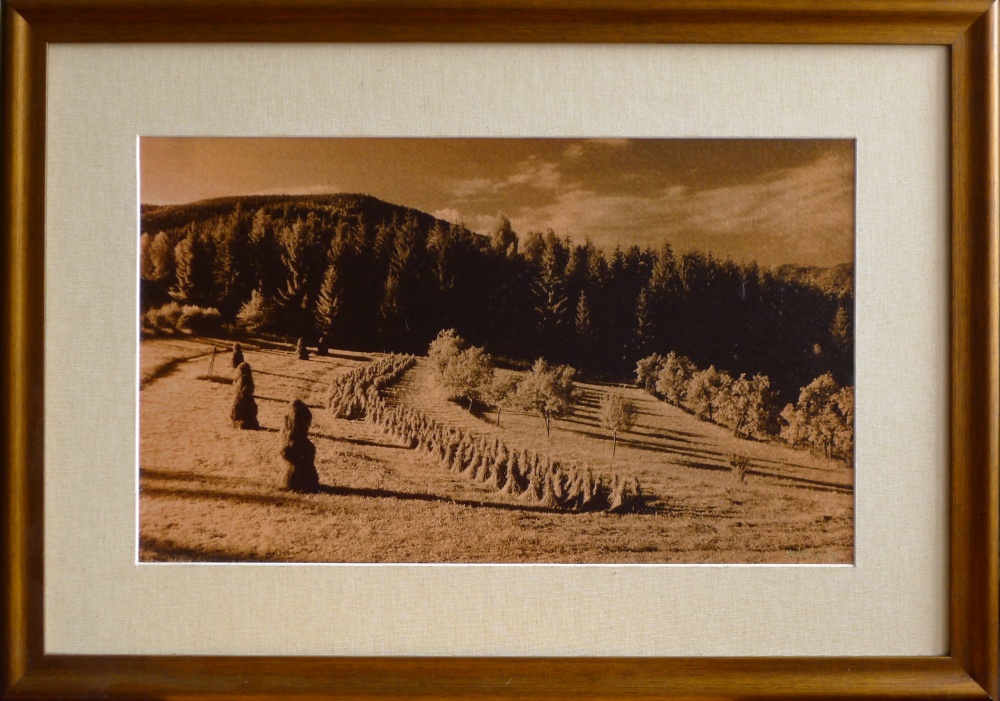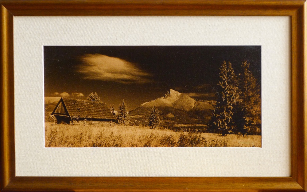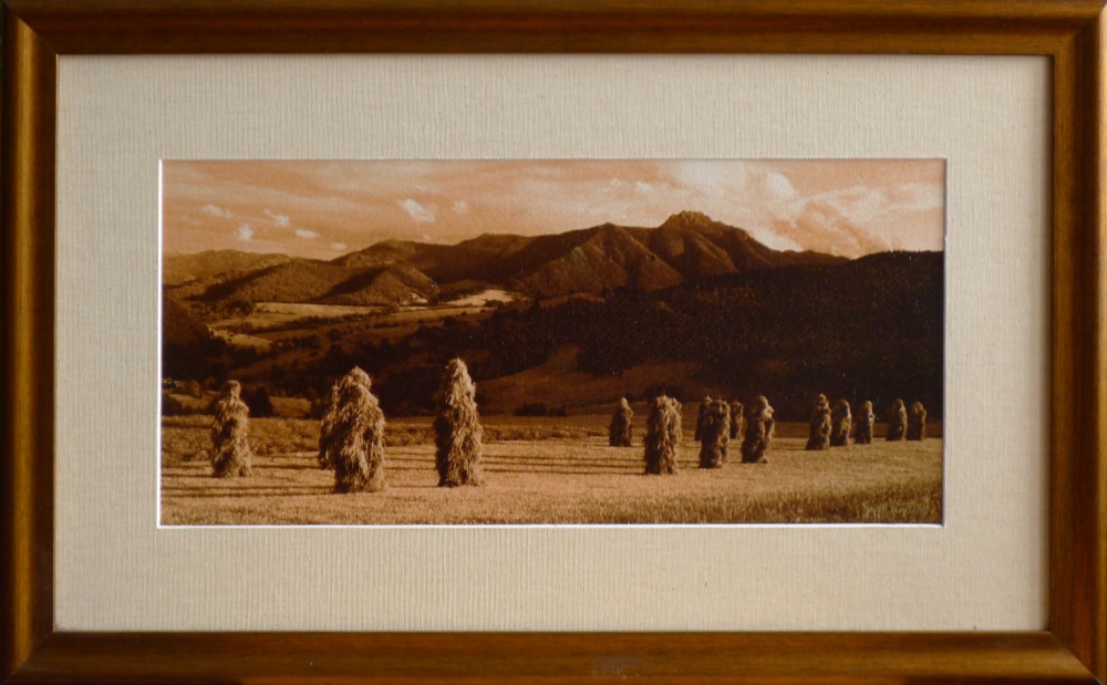 Sú to obrazy Vysokých Tatier a slovenskej krajiny kde človeka síce nevidieť ale je ho tam cítiť, tie typické kôpky sena, staré senníky, úzke políčka....no a následne tónovanie sépiou a 24 karátovým zlatom.