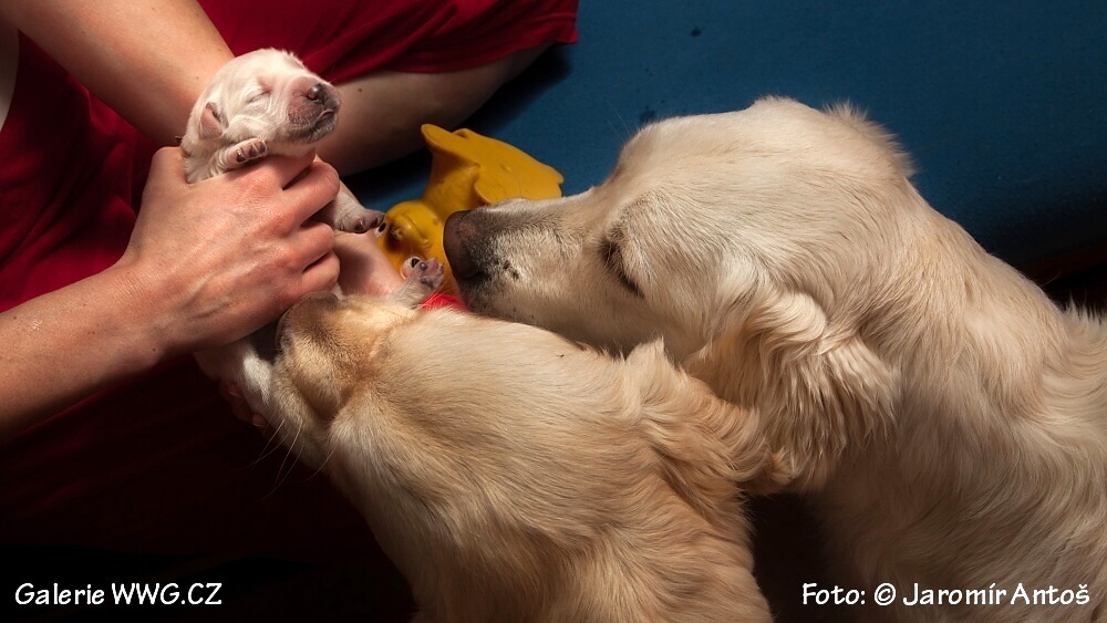 intimní chvilka – mladá Berinka se učí od zkušené matky Broock, jak se čistí štěně.